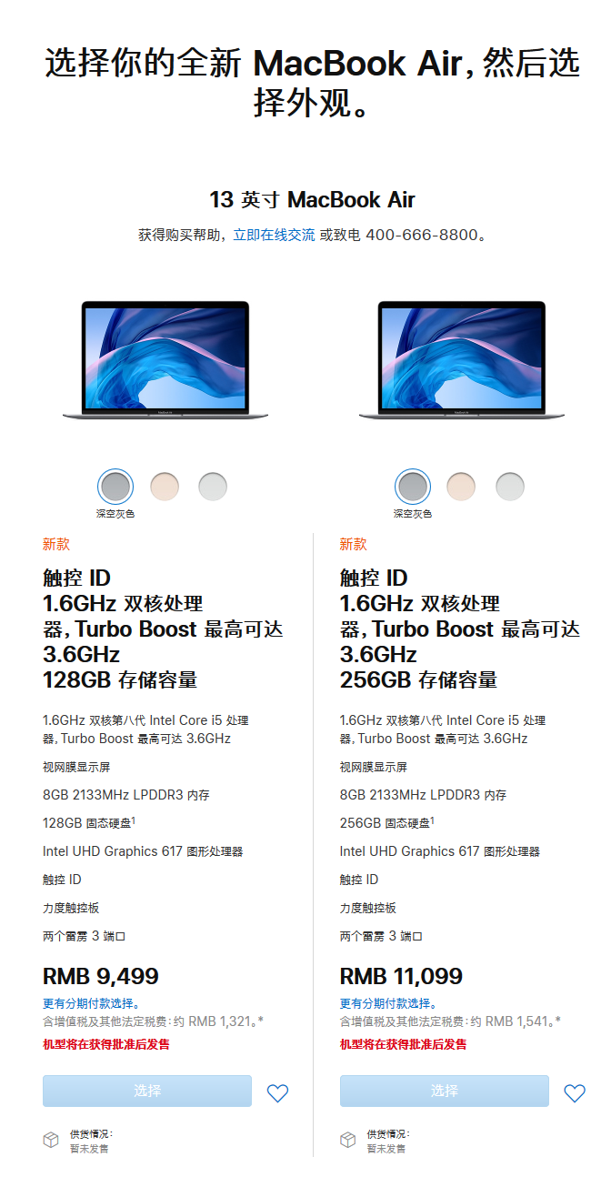 现阶段中国发行8GB 128GB版本号(3.8GHz 四核第八代 Intel Core i3 CPU)市场价为6499元;8GB 258GB版本号(3.0GHz 六核第八代 Intel Core i5 CPU)市场价为8899元。